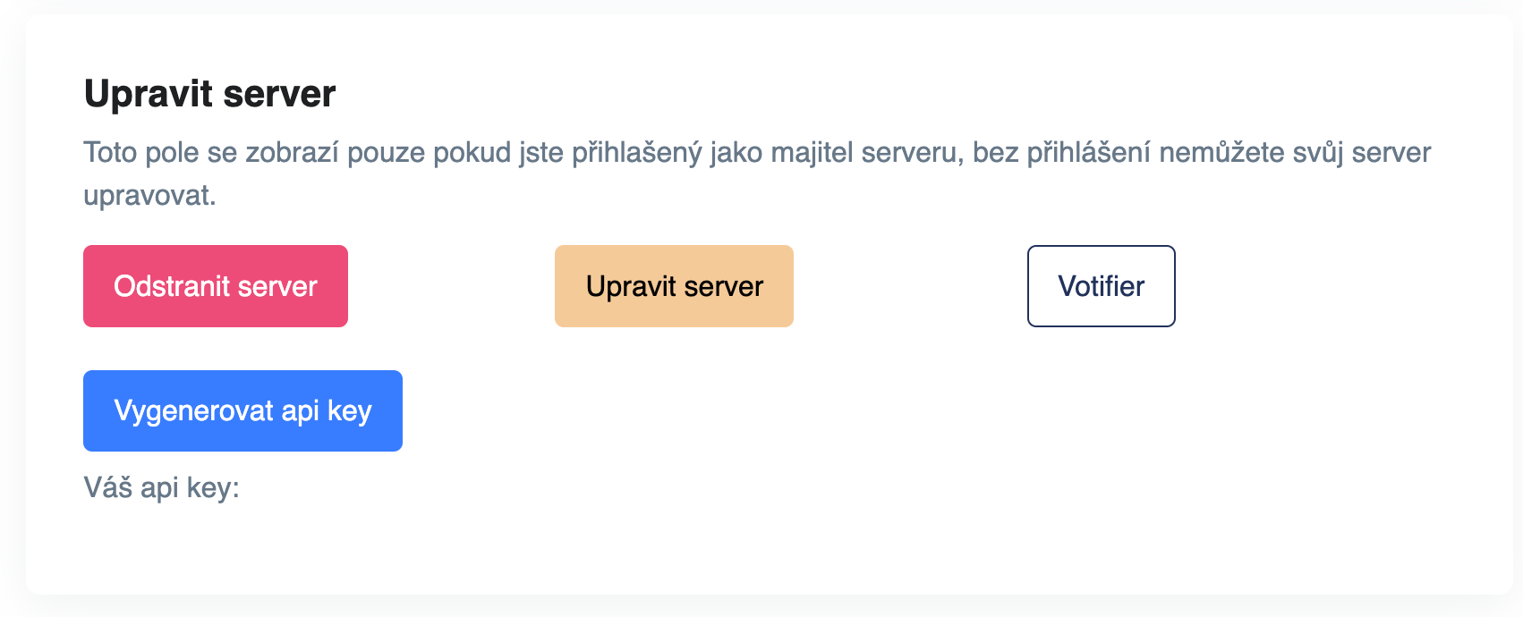 Pod popisem serveru naleznete box s názvem „Upravit server“. Zde stačí kliknout na tlačítko vygenerovat api key.